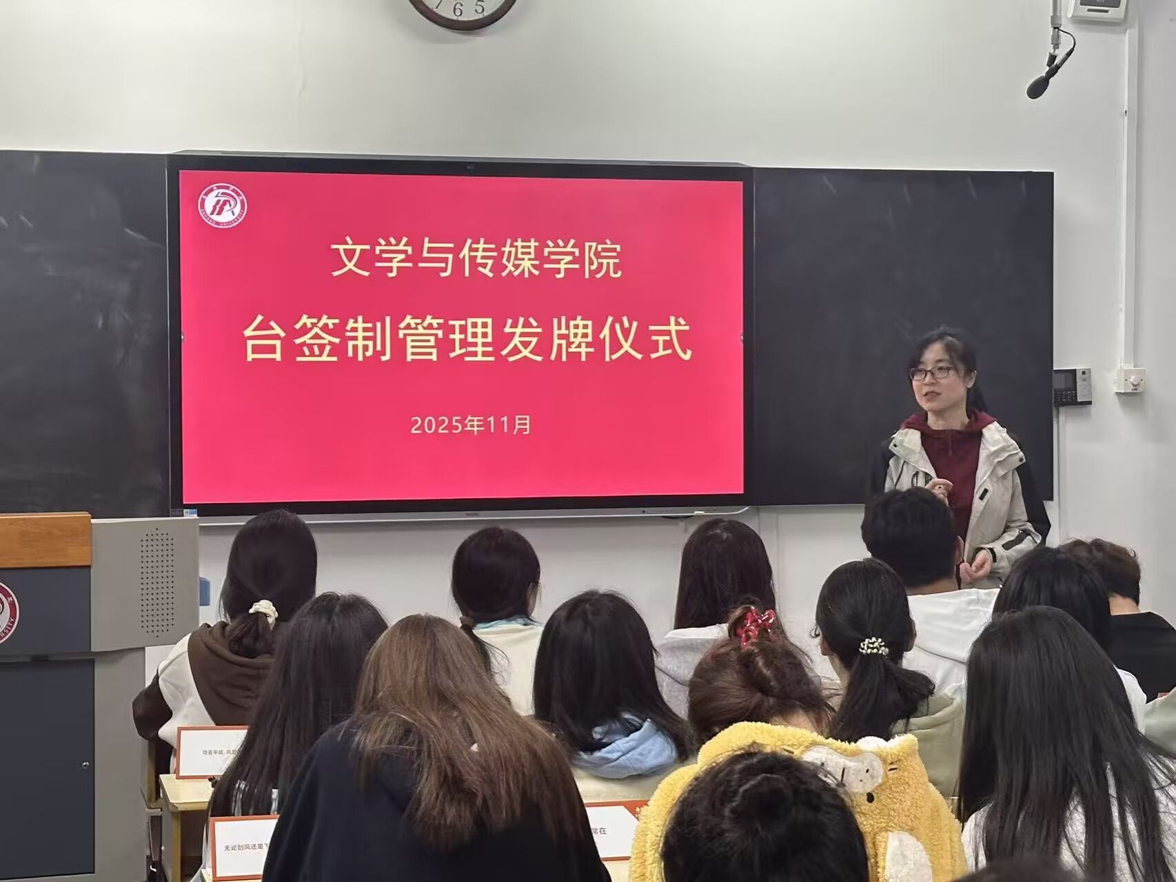 为深化学风建设,创新管理抓手,滚球买球的app官网于11月2日正式启动覆盖2025级320名学生的台签制管理模式,并举行发牌仪式。学院党总支副书记侯红艳、辅导员喻言及全体新生参加仪式。仪式由喻言主持。