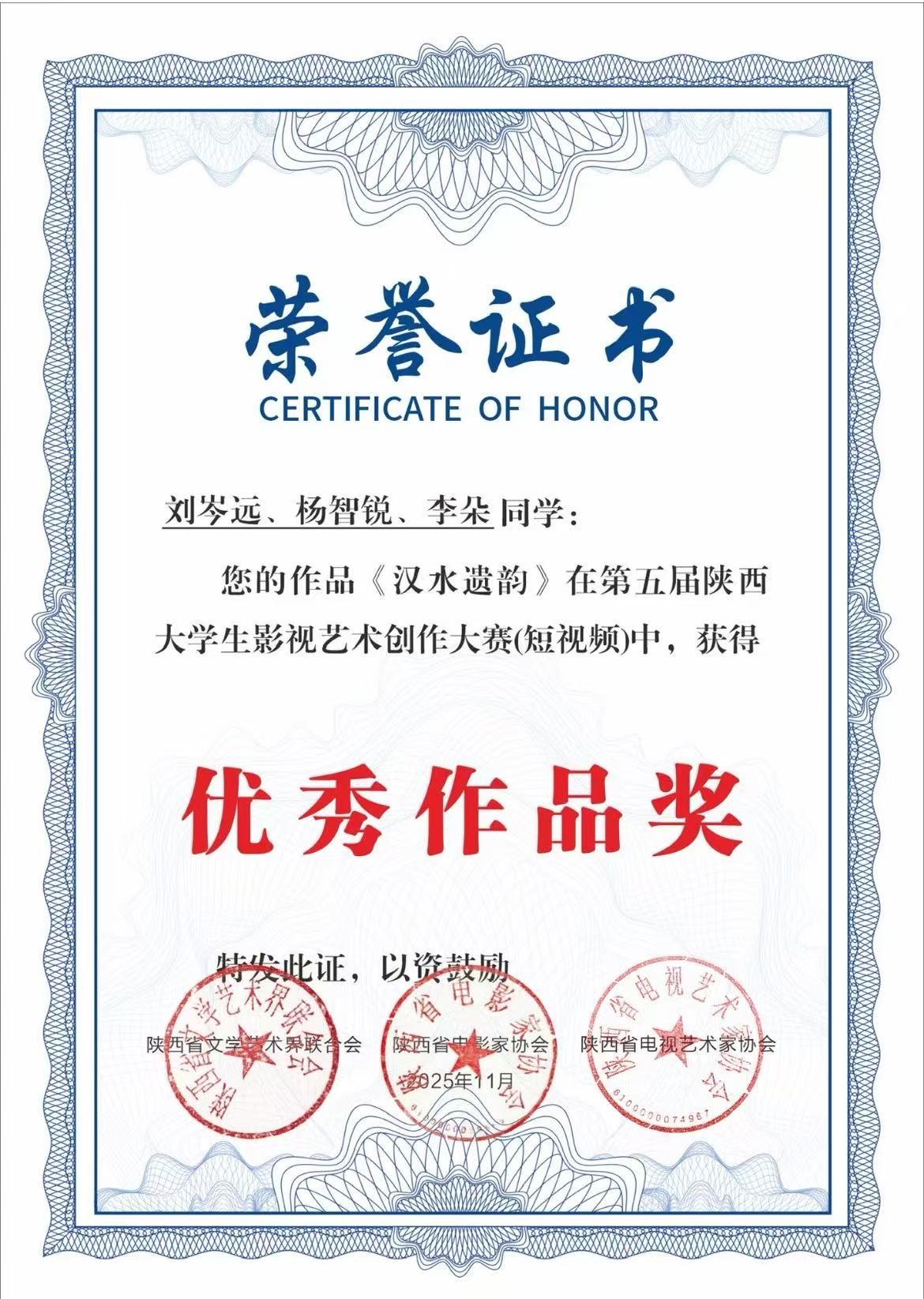 近日,由陕西省文学艺术界联合会、陕西省电影家协会、陕西省电视艺术家协会联合主办的第五届陕西大学生影视艺术创作大赛评选结果正式揭晓,滚球买球官网网络与新媒体专业学生刘岑远、杨智锐、李朵在崔瑜老师指导下创作的非遗题材短视频作品《汉水遗韵》荣获优秀作品奖。