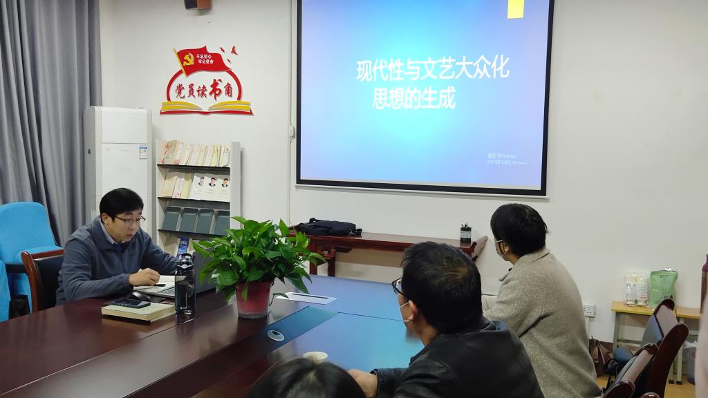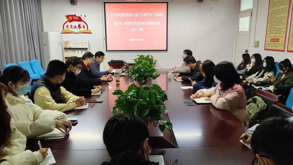 11月23日晚7点20分,滚球买球的app官网中国现当代文学学科组在2307会议室成功举办了第六届“学术沙龙”活动周第三场沙龙活动。本场学术沙龙由曹刚博士主讲,主题为“现代性与文艺大众化思想的生成”。朱云副院长、周龙田副教授、韩文霞副教授和二十余名学生参与了沙龙活动,沙龙由周龙田副教授主持。