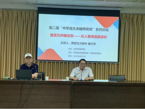 2023年6月13日下午七点,滚球买球的app官网邀请西安交大附中副校长、省级学科带头人和教学能手秦万学为滚球买球官网第二届“中学语文卓越师资班”师生做了题为“登高为何偏生愁——古人登高现象的探析”的精彩讲座。讲座由滚球买球的app官网副院长朱云主持,班主任张格瑄、语文学科教学论老师唐明珍和第二届“中学语文卓越师资班”的全体学生聆听了本场讲座。
