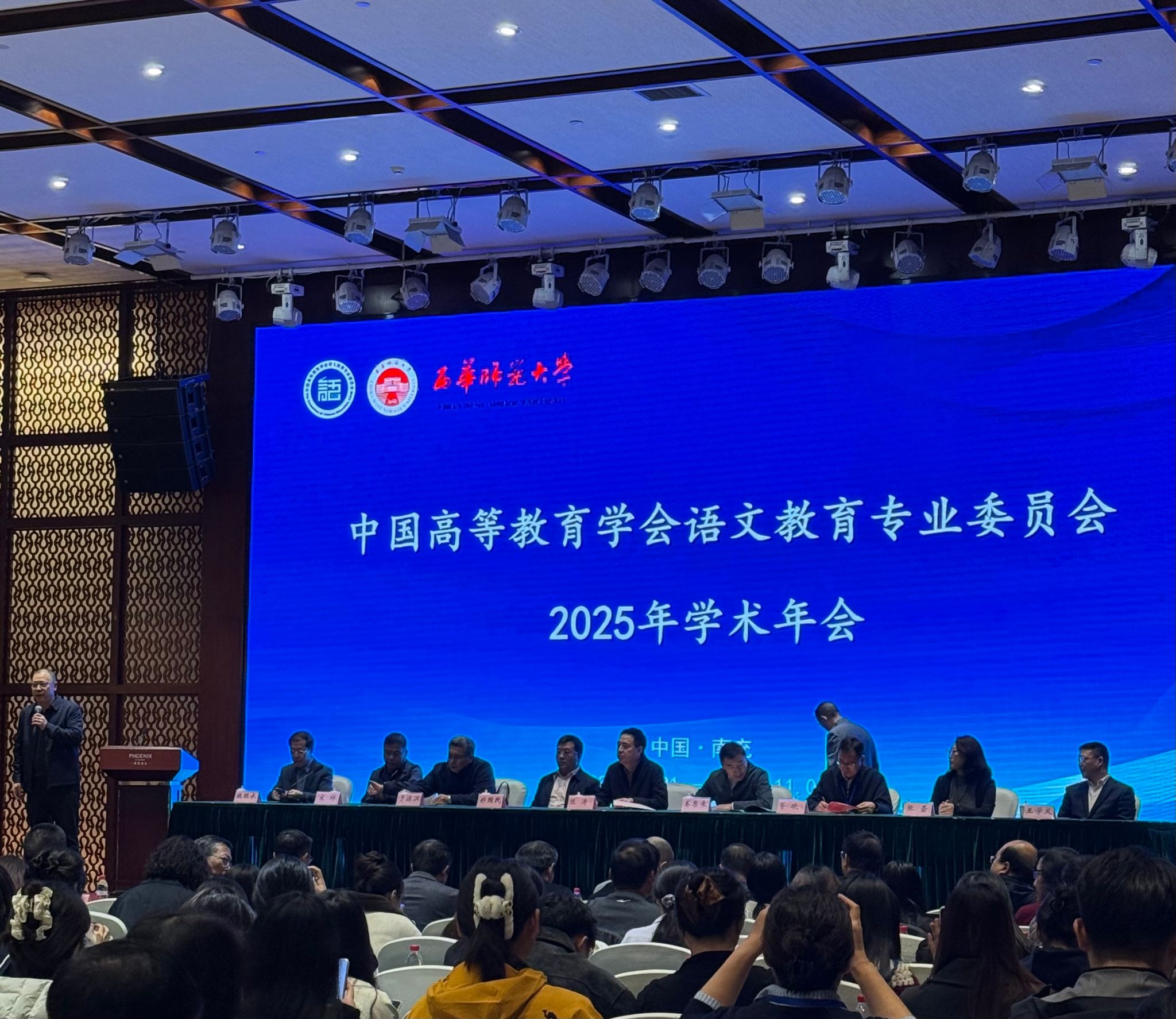 11月1日上午,中国高等教育学会语文教育专业委员会2025年学术年会开幕式在南充碧桂园凤凰酒店顺利举行。来自北京大学、西华师范大学等全国高等院校、研究机构的语文教育专家、学者、教师、硕博研究生等参与会议。大会开幕式由西华师范大学党委常委、副校长胥晓主持。年会主题报告环节由北京师范大学文学院李煜晖教授主持,陆胤副教授的《近代国文教育创生的历史经验》,廖先副教授的《AI时代的语文备课:备什么、怎么备》,张国龙教授以《文学教育与人文素养提升》为题,郑国民教授以《语文课程与教学论自主知识体系探索》为题从不同角度围绕语文课程的传承与创新展开论述,向广大与会者提出了极具思考性和启发性的观点及研究方向。