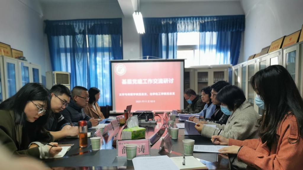 为了深入贯彻落实学校党委新时代党建工作要求,结合党史学习教育安排,扎实推进滚球买球的app官网党建“双创”工作,11月18日下午,滚球买球的app官网党总支书记芦伟、副书记杨海蓉、教工党支部书记韩文霞、谭诗民、学生党支部书记彭潇、薛涛一行前往化学化工学院党总支进行党建“双创”工作交流学习。化学化工学院党总支书记王永东、学生党支部书记王瑜、组织委员许珂瑶、宣传委员于正豪出席了交流座谈会。双方就做好新时代党建“双创”工作进行了深入的交流。
