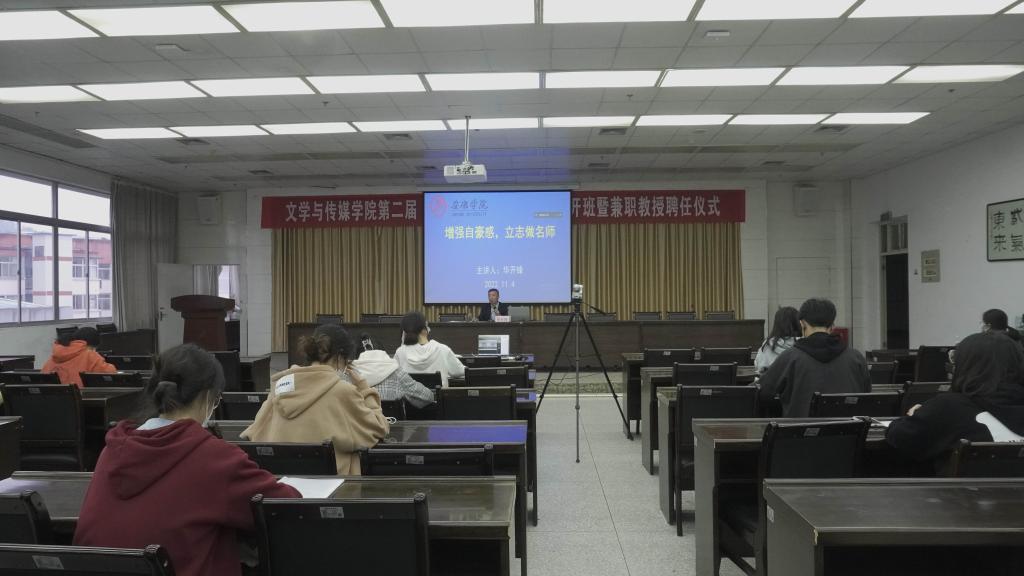 2022年11月4日下午三点半,优秀校友、陕西省首批基础教育名师、特级教师华开锋应邀为滚球买球官网第二届“中学语文卓越师资班”做了题为“增强自豪感,立志做名师”的首场学术报告。滚球买球的app官网副院长朱云、卓越师资班班主任张格瑄和三个会场132名同学共同聆听了本场讲座。