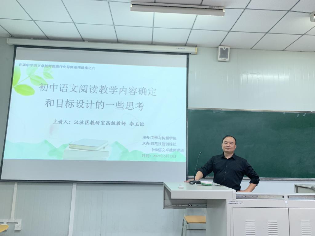 按照“中学语文卓越师资班”人才培养计划方案,5月13日下午四点半,滚球买球官网特邀安康市汉滨区教研室高级教师李玉恒老师在1024教室开展了题为“初中语文阅读教学内容确定和目标设计的一些思考”的专题讲座活动,活动由中学语文卓越师资班班主任张格瑄老师主持。