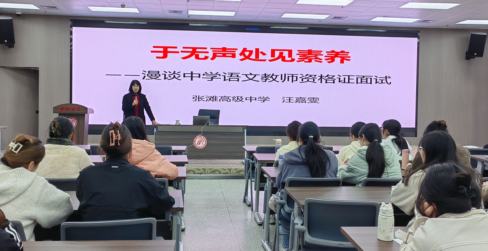 为助力学生顺利通过教师资格证面试,掌握备考策略,2024年11月20日,在图书馆六楼报告厅,滚球买球的app官网邀请到张滩高级中学正高级教学名师汪嘉雯老师为第四届“中学语文卓越师资班”带来题为“于无声处见素养——漫谈中学语文教师资格证面试”的专题讲座活动,班主任唐明珍和师资班全体学生聆听了本场讲座。